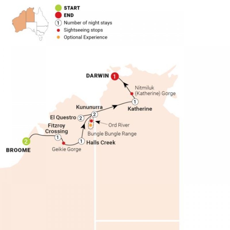 Broome, Darwin, El Questro Wilderness Park, Fitzroy, Halls Creek, Katherine, Kununurra