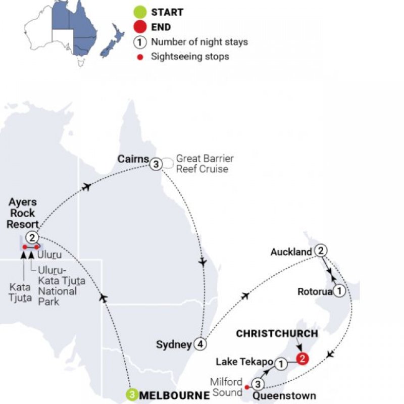 Three World Heritage Sites on one tour? It’s a reality on this two-country adventure. Whether you’re drifting across the Great Barrier Reef, sailing Sydney Harbour, gazing at Uluru-Kata Tjuta or cruising through Milford Sound, this Melbourne to Christchurch tour has ‘pinch me’ moments abound. These moments come with experiences of Indigenous heritage, from Maori hangis in Rotorua to Aboriginal guides in the Red Centre.
